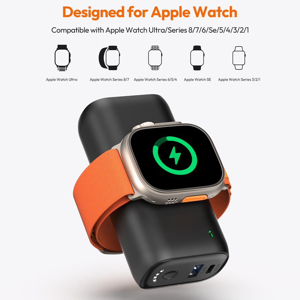 Designed for Apple Watch/iPhone: The portable charger features an Apple Watch wireless charging module and a built-in cable to charge both Apple Watch and iPhone, compatible with Apple Watch Series 8/Ultra/7/6/Se/5/4/3/2, iPhone 14/13/12/11/XS/X/8 series.