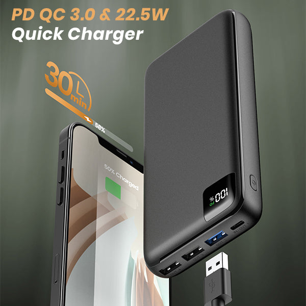 Ultra-Fast Charging: Combining the latest power delivery and QC 3.0 technology, the battery pack provides amazing 22.5W fast charging for supported devices, charging up to 60% in less than 30 minutes.