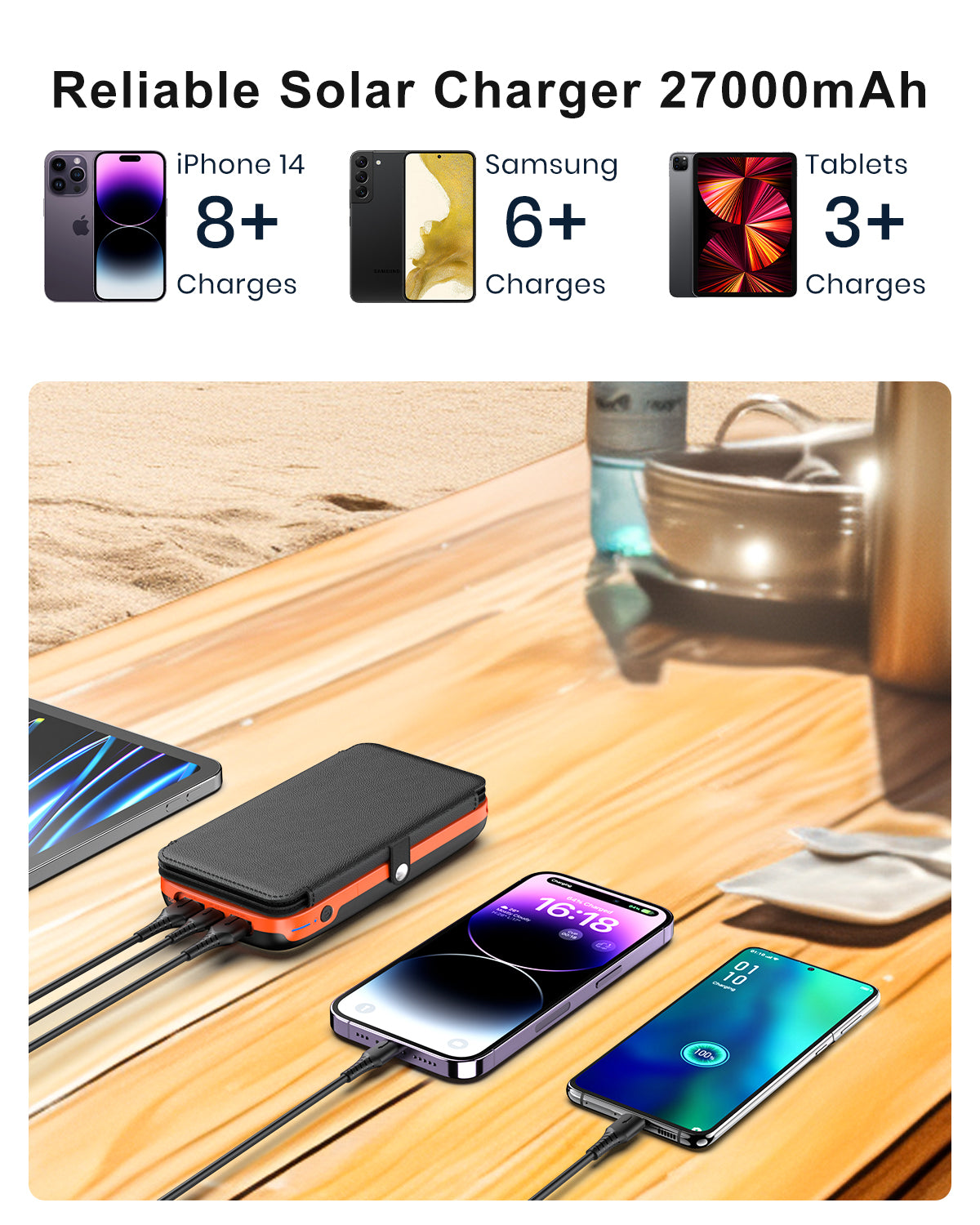 【Large Capacity is Better】The 27000mAh large-capacity solar battery charger can charge an iPhone 14 more than 8 times and a Samsung Galaxy S23 nearly 6 times. It is perfect for family outings, camping, cycling, fishing, and any other outdoor activities. Meet the needs of your daily outdoor activities.