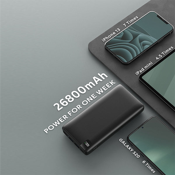 Ultra-High Capacity: The massive 26800mAh capacity will provide more than 8 charges for iPhone 11, 6 charges for Galaxy S10 and 3 charges for Tablet, stay powered for days.